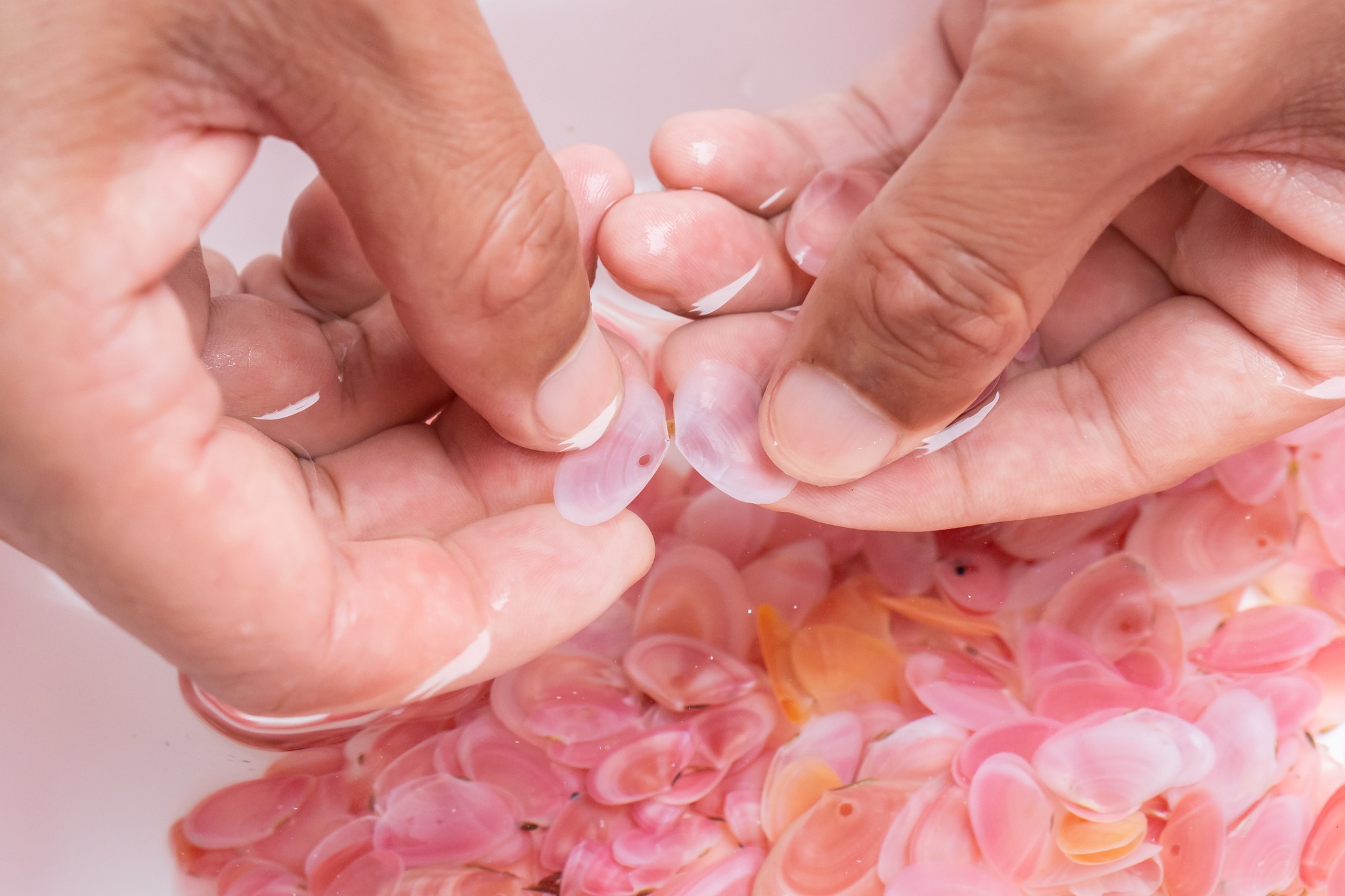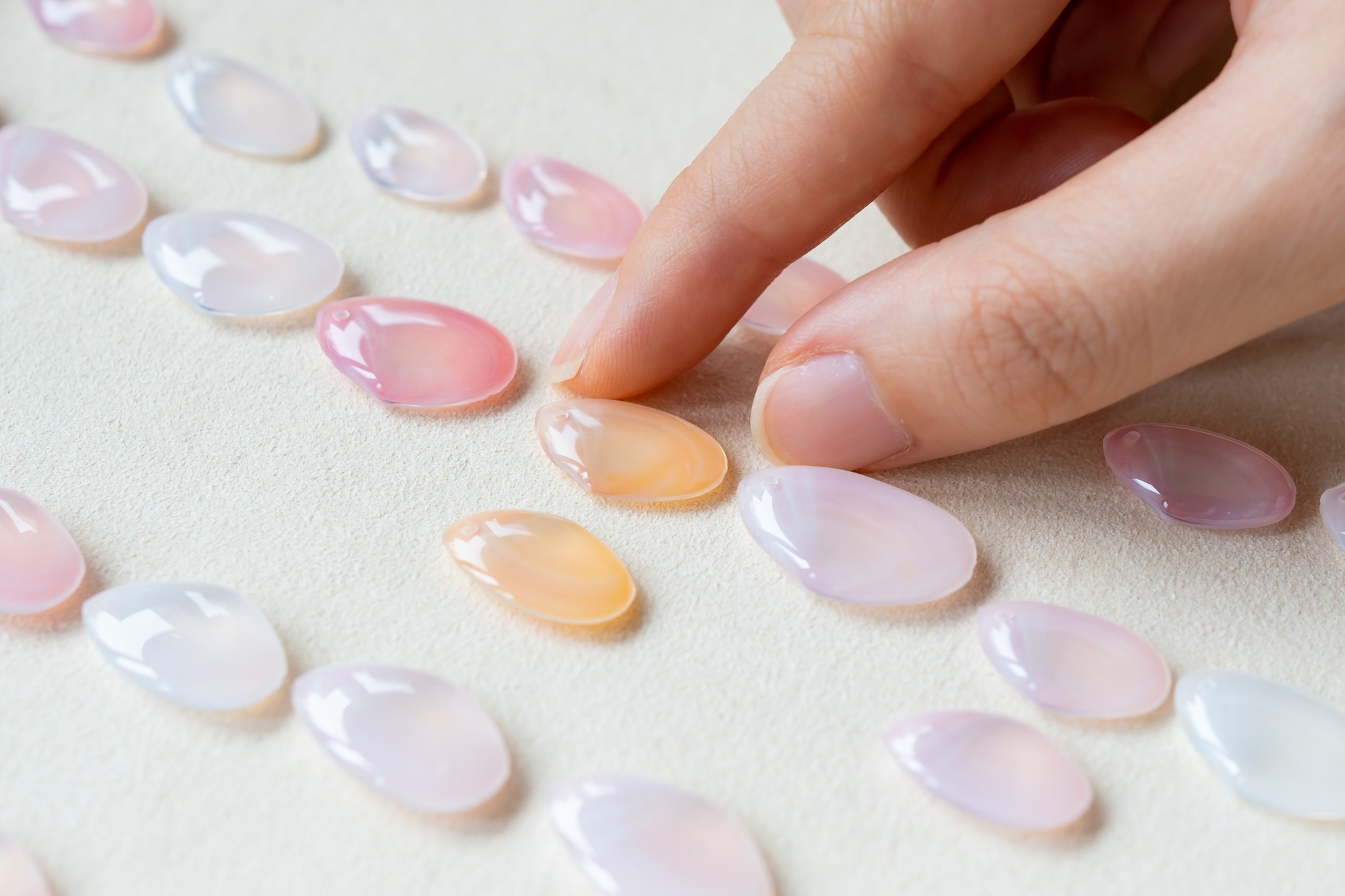 特別な樹脂でふくよかにコーティング──拾い上げたばかりの海の滴を纏ったかのようなみずみずしい仕上がりが、桜貝本来の優しい天然色と儚い透明感を際立たせます。