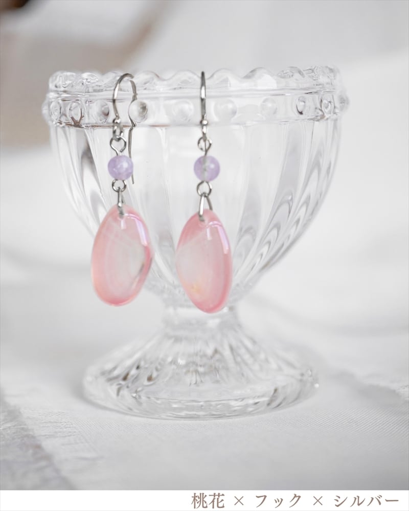 「さくらひとえ」シリーズは、その桜貝を特別な樹脂でふっくらとコーティング。海からすくい上げたばかりの滴をまとったような艶やかさが、桜貝本来のやさしい天然色を際立たせます。
