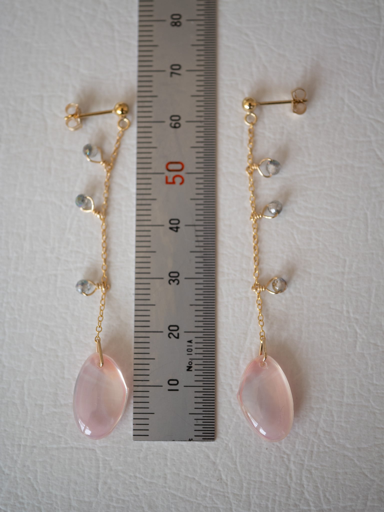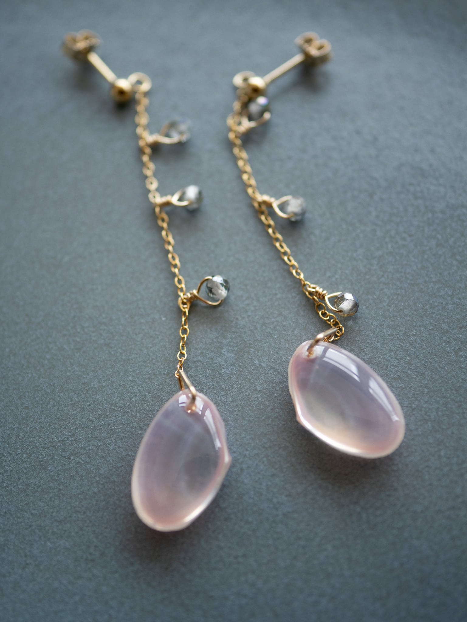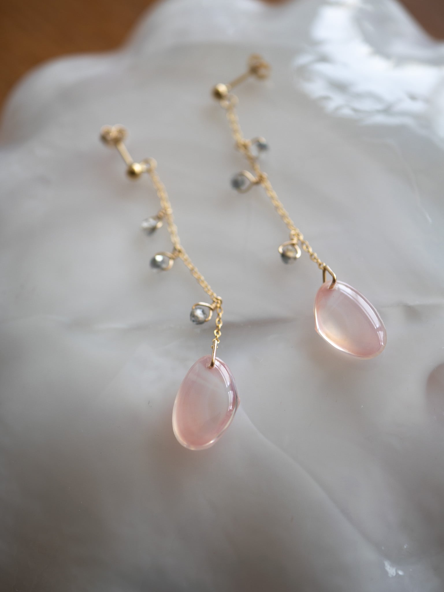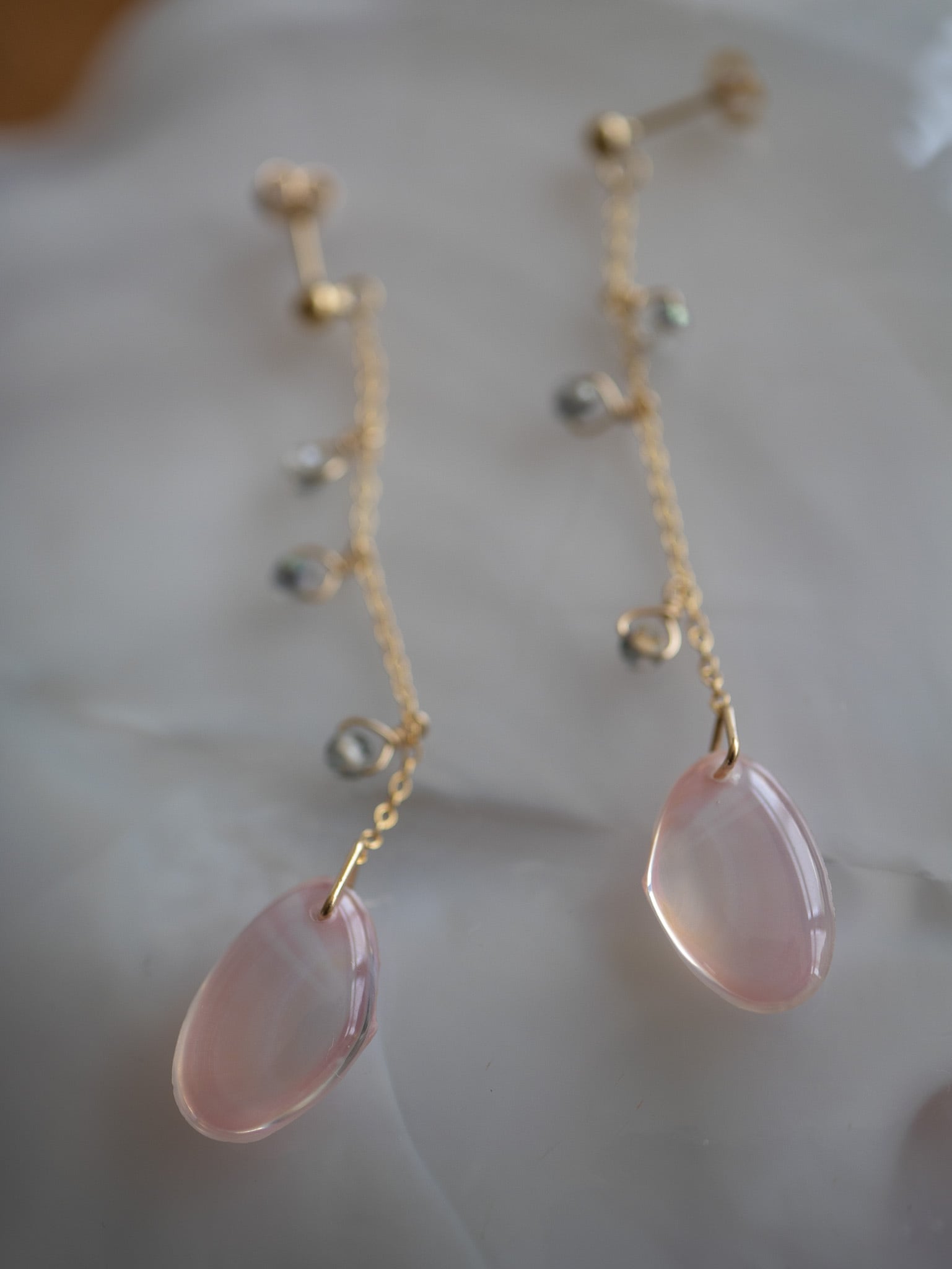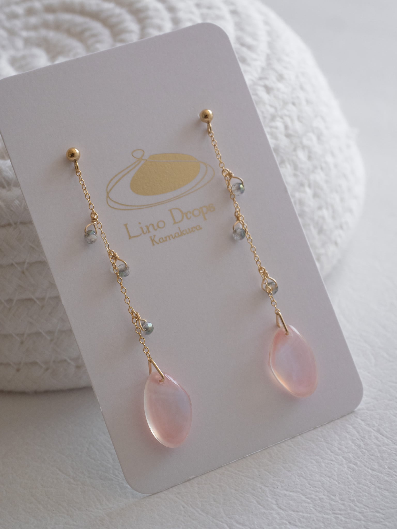 華奢なチェーンと小さな天然石、小ぶりの桜貝を組み合わせることで、普段長さのあるピアスを着用しない方でも使いやすいデザインに仕立てました。