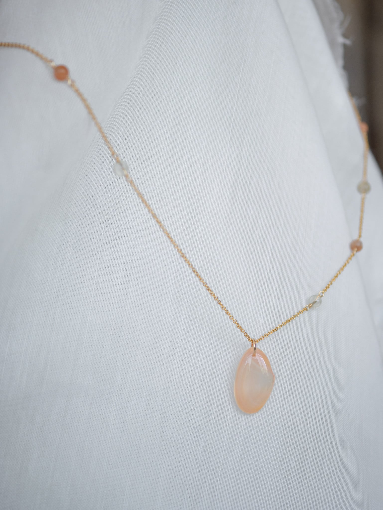 桜貝も天然石も穏やかなトーンのオレンジなので、コーディネートに取り入れやすい組み合わせ。