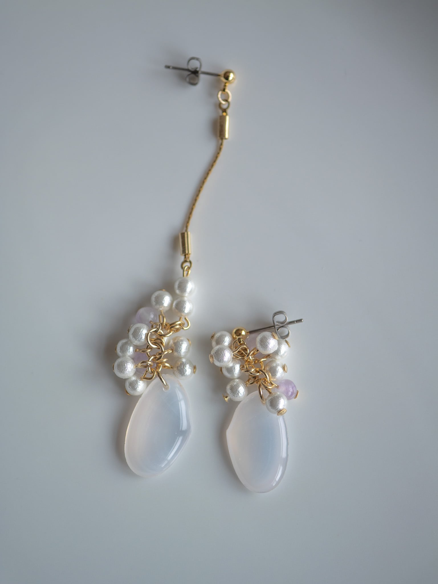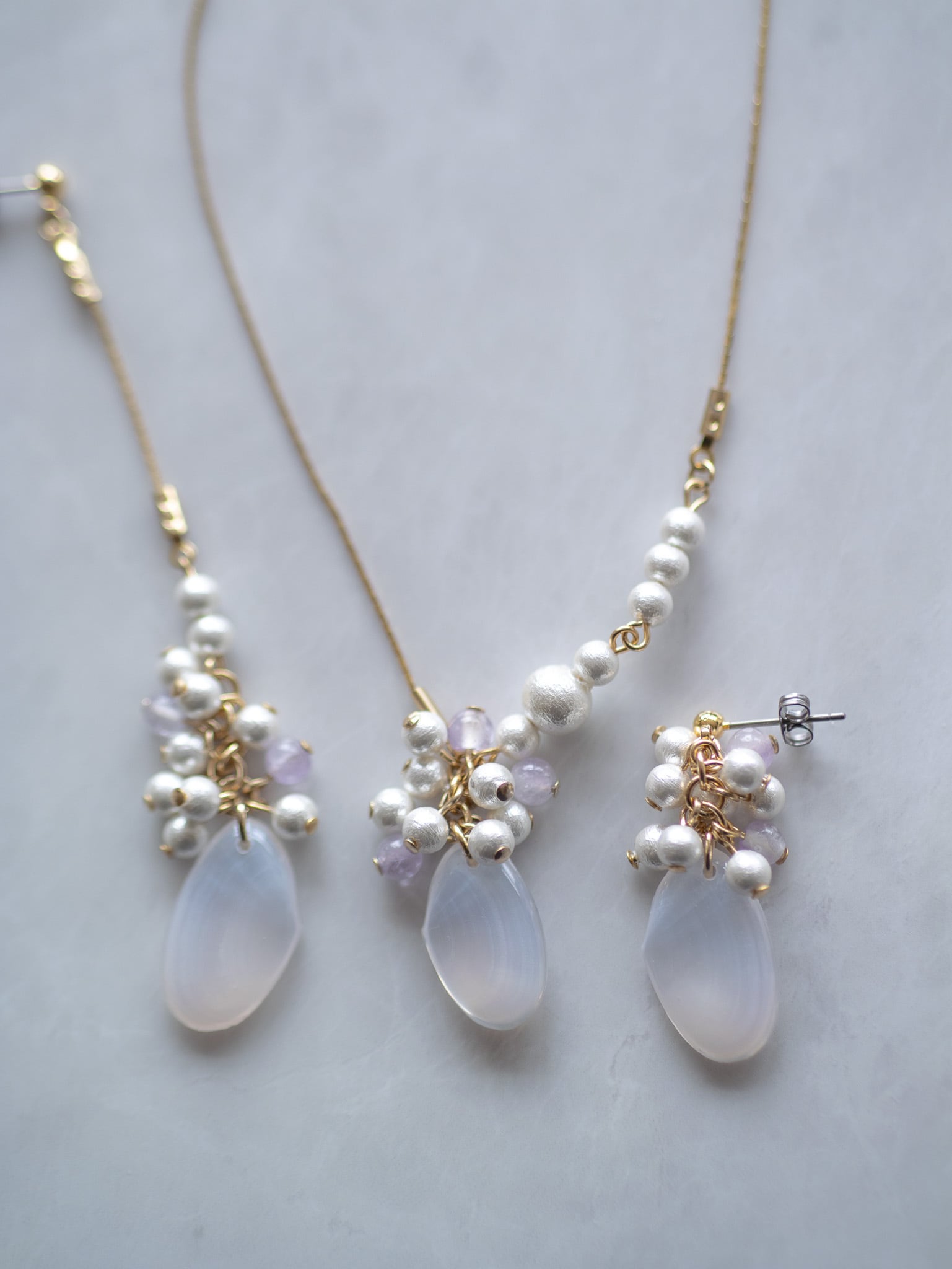 真白な桜貝、小粒のコットンパールとライトアメジストを束ねた房が、貴方の耳元・胸元で優しく輝きます。