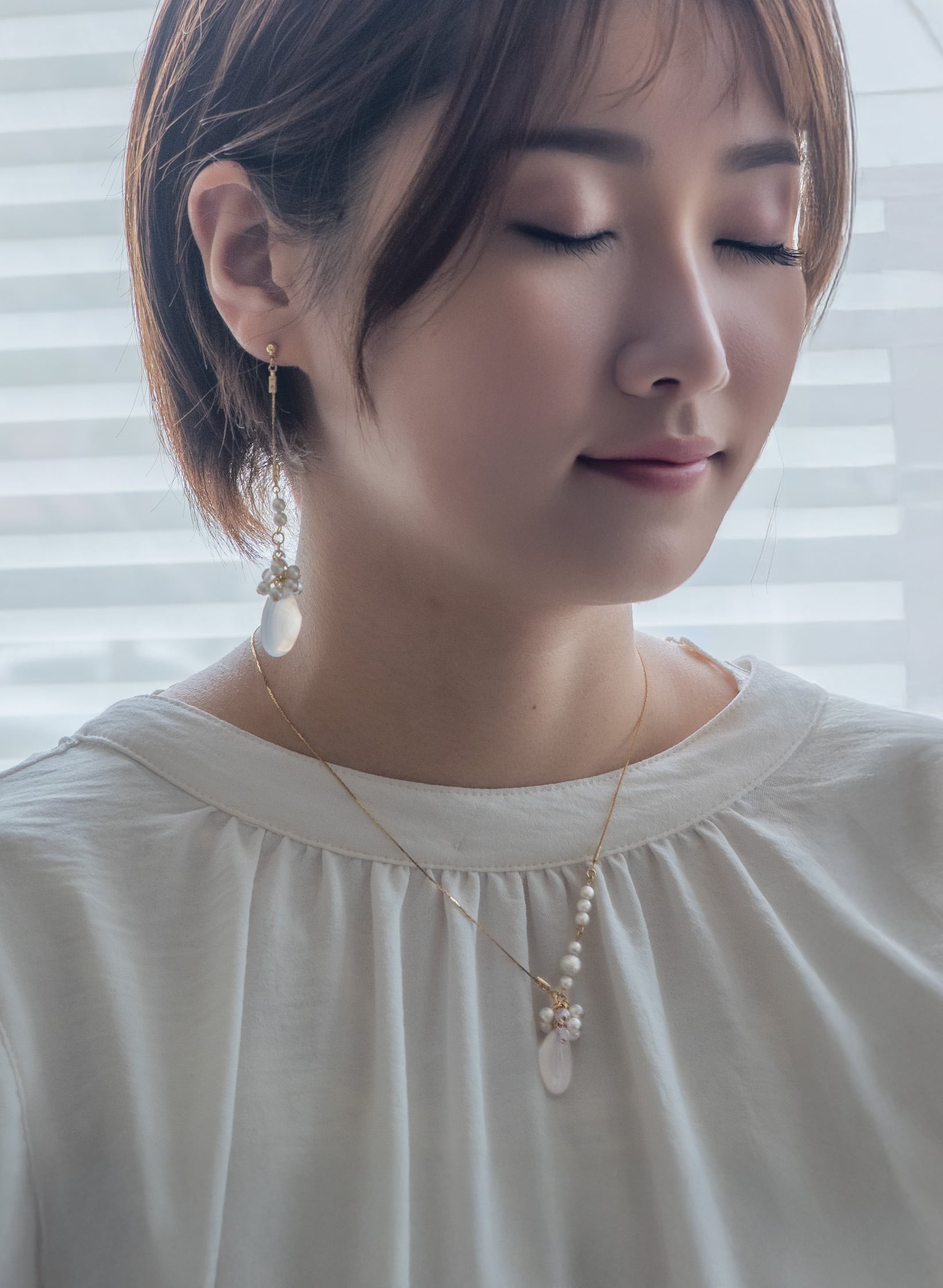 ピアスは長さを。ネックレスは大小のコットンパールの位置をアシンメトリーにすることによって、より洗練された印象に。