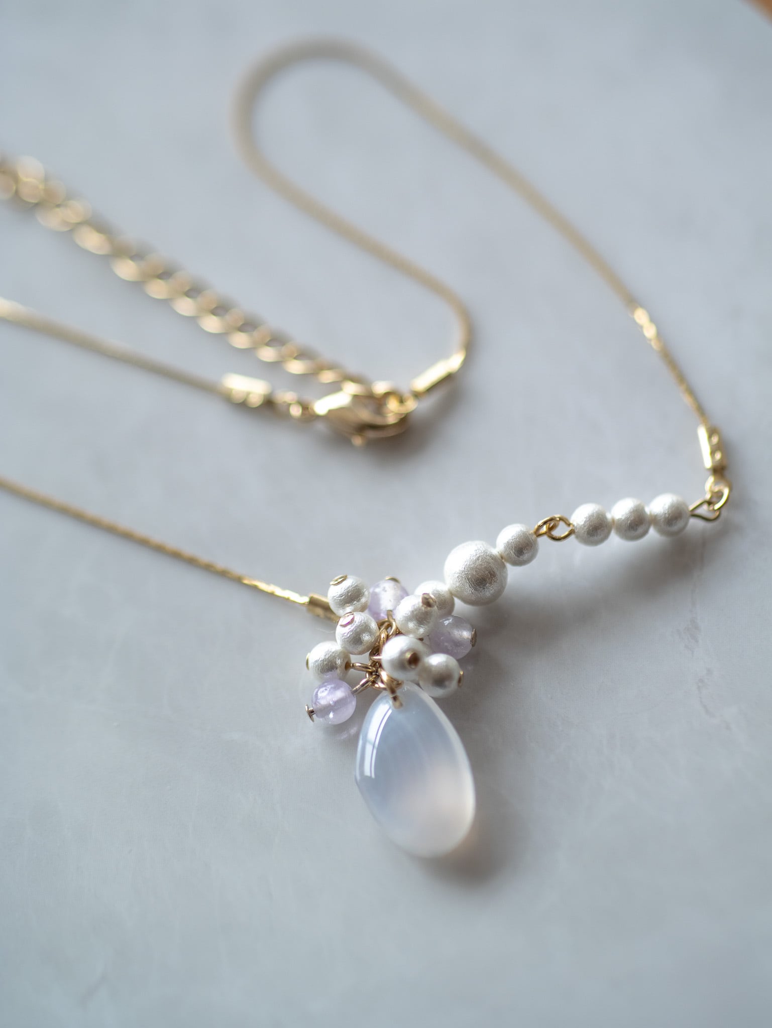 繭のようなふんわりとした温もりを感じるコットンパールと、儚げなライトアメジストをあしらい、しなやかなスネークチェーンで紡ぐように繋げた「cocoon」シリーズ。