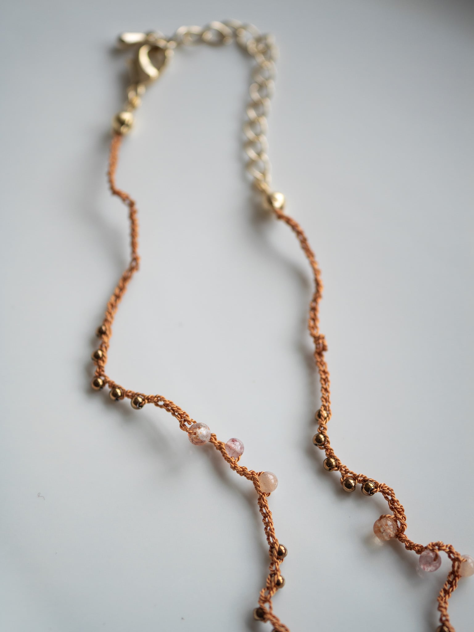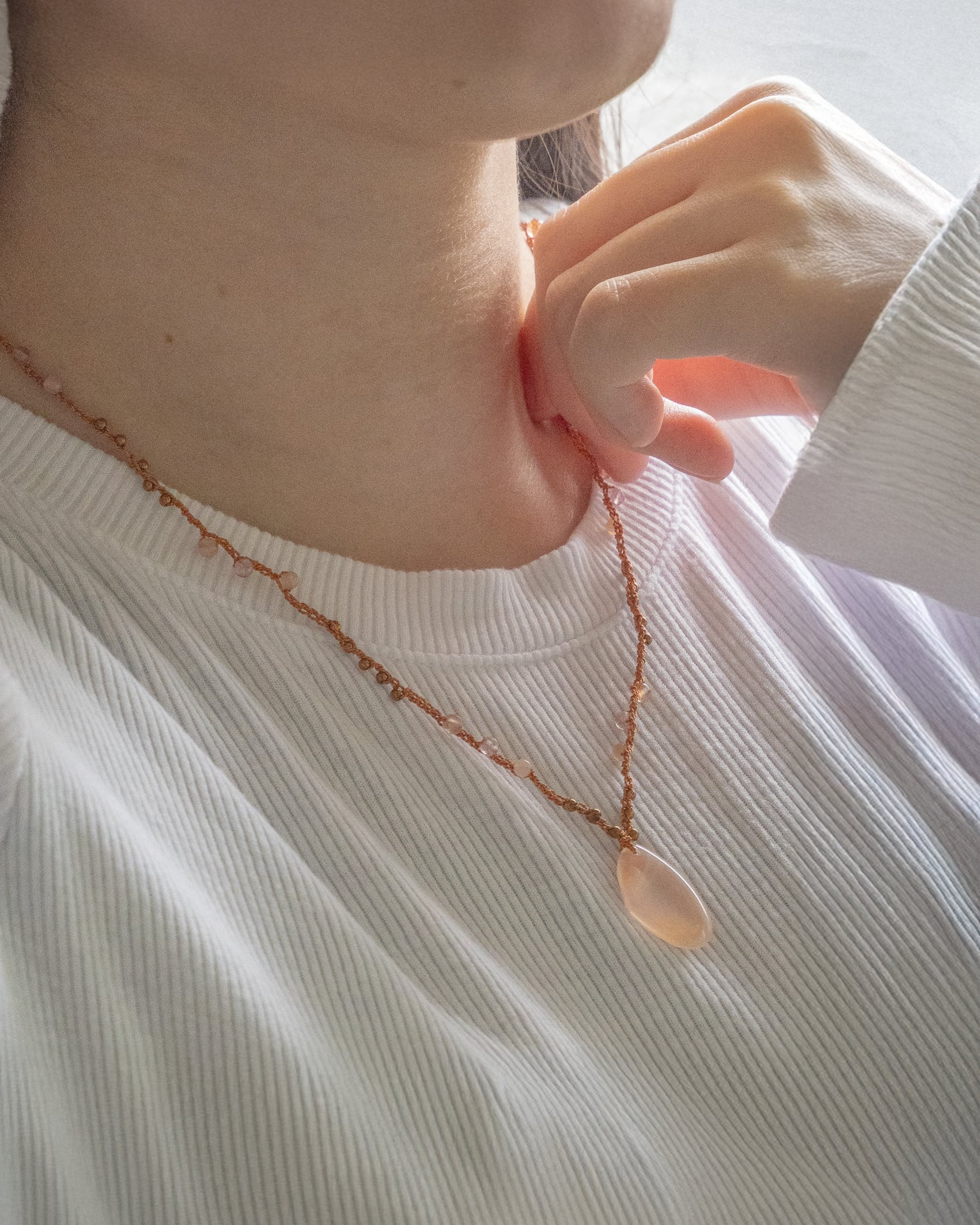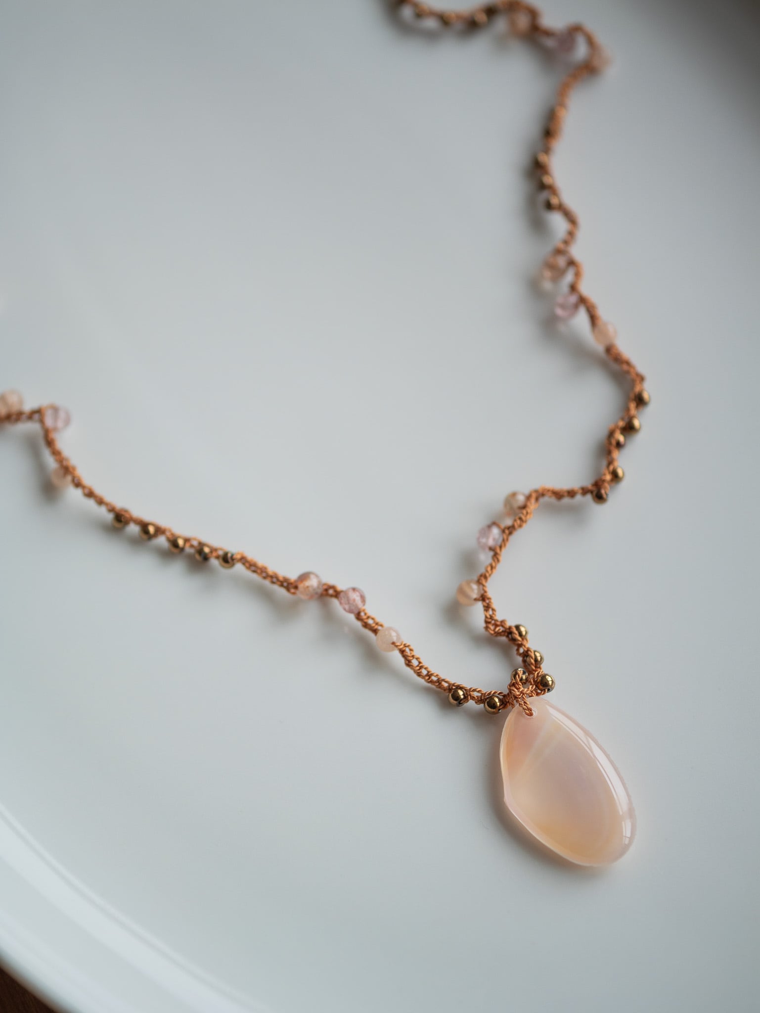 繊細な絹糸のコードでひとつひとつ手編みされたシルクネックレス。