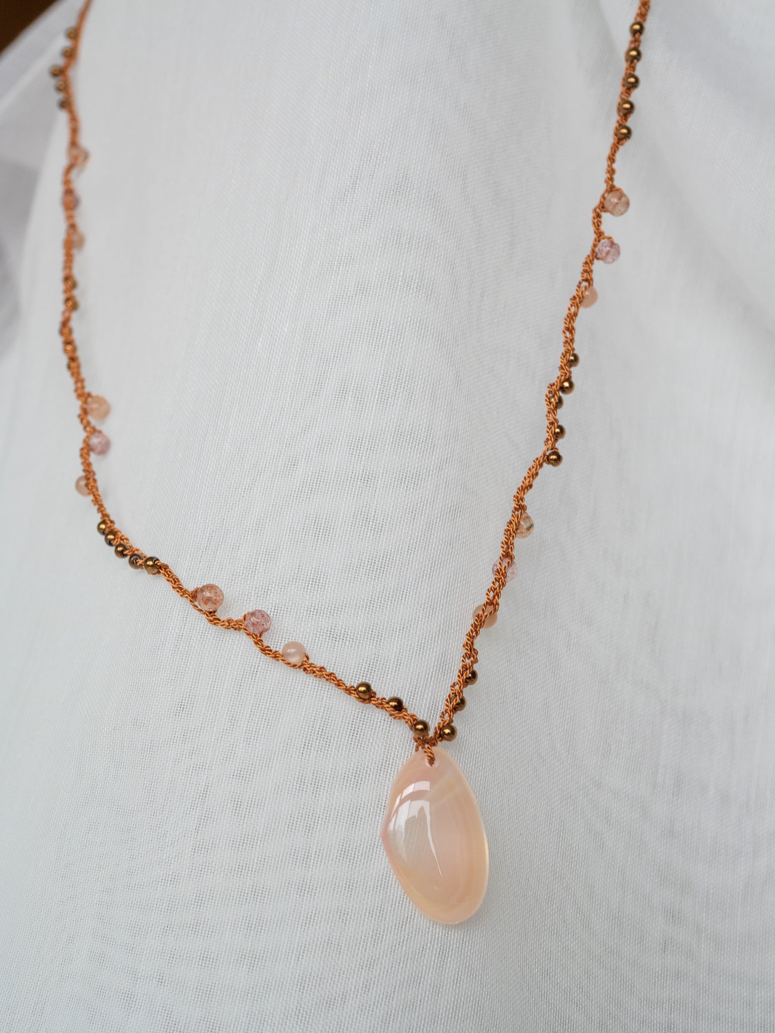 シルクの滑らかな光沢と、桜貝が持つ自然の美しい色彩。その二つが組み合わさり、天然素材ならではの柔らかさを生み出します。