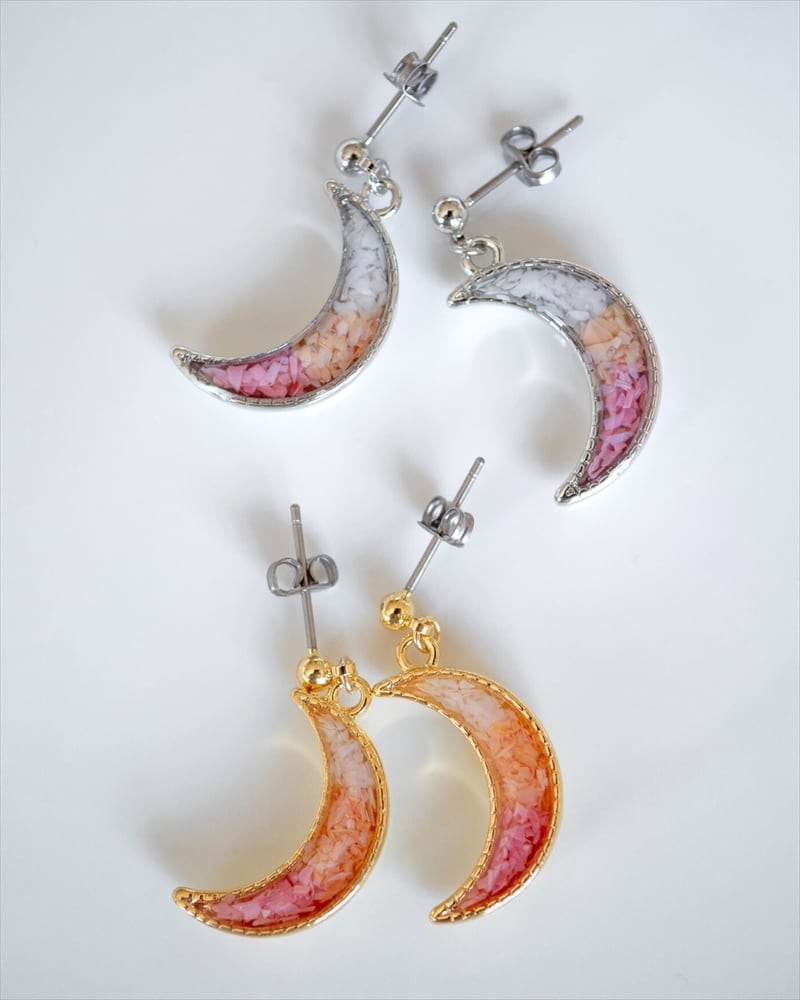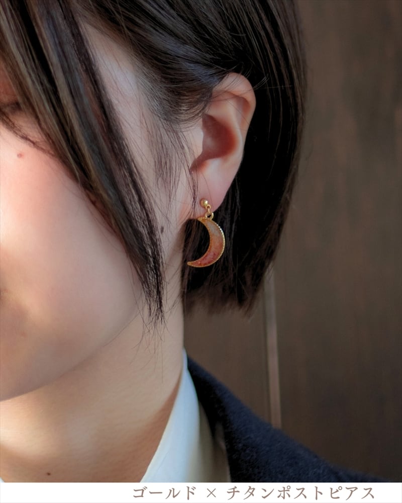 耳元でゆらゆらと揺れる月のシルエットは、華やかさの中に知的な雰囲気を漂わせ、大人の女性の横顔を美しく引き立てます。