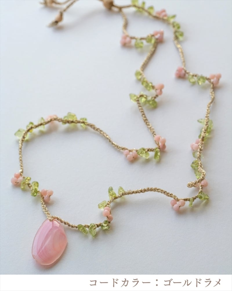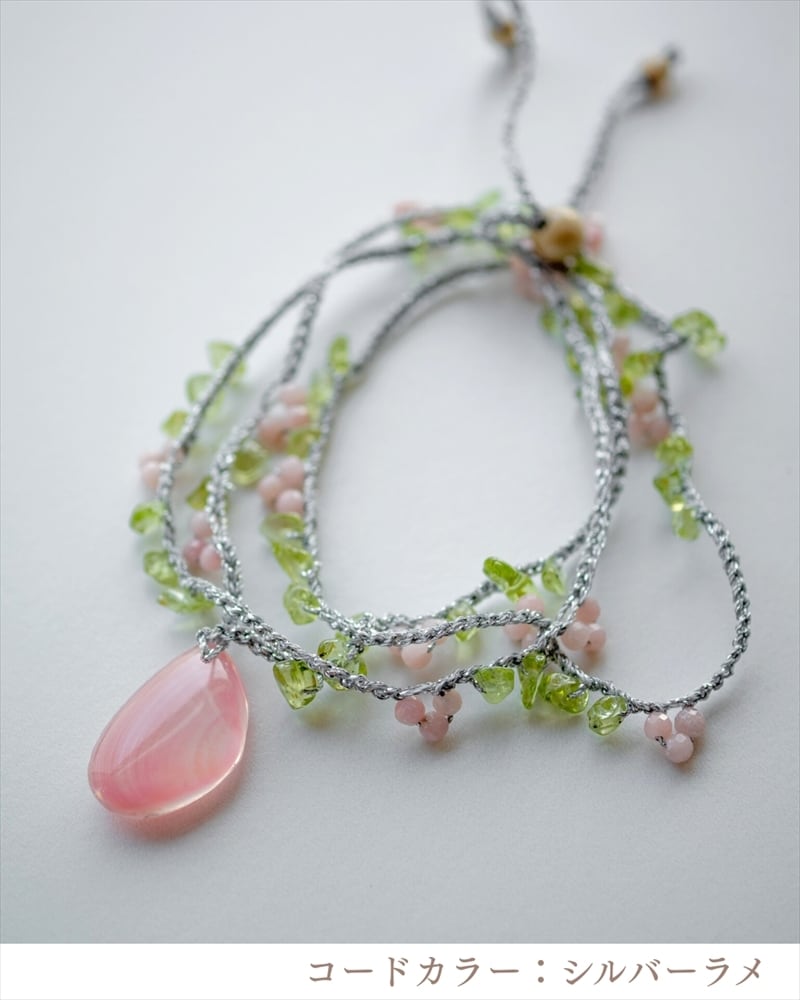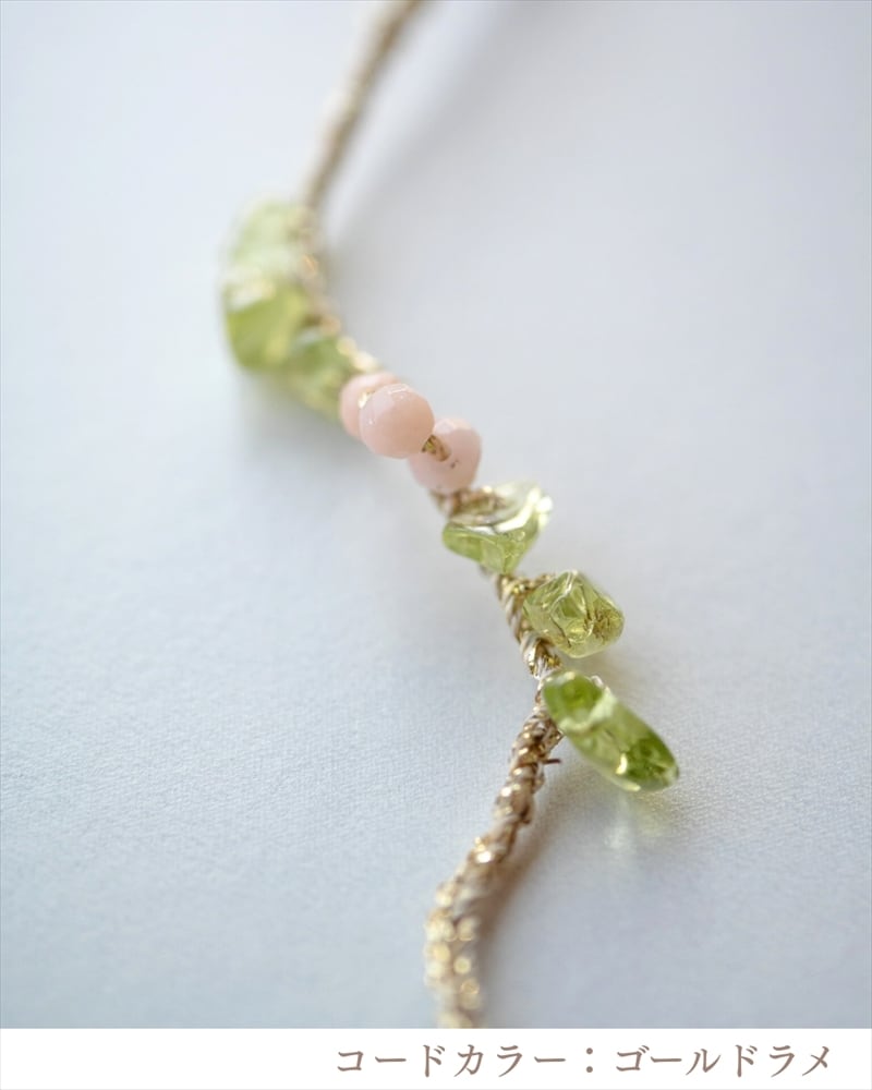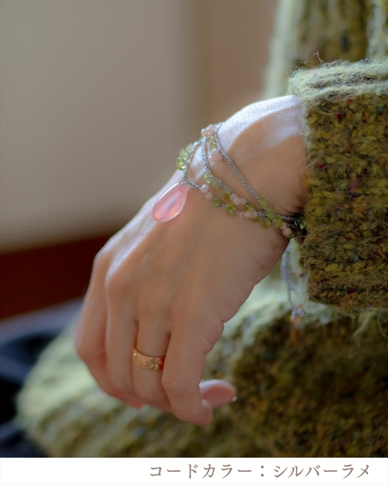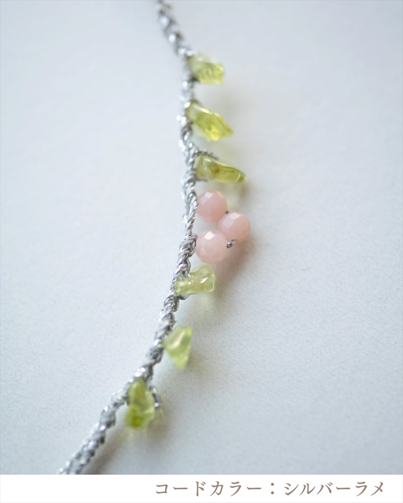 柔らかな色彩のピンクソープを3粒まとめて編み込み、その間にペリドットのさざれを散りばめ、枝から垂れる馬酔木の葉と花に見立てています。