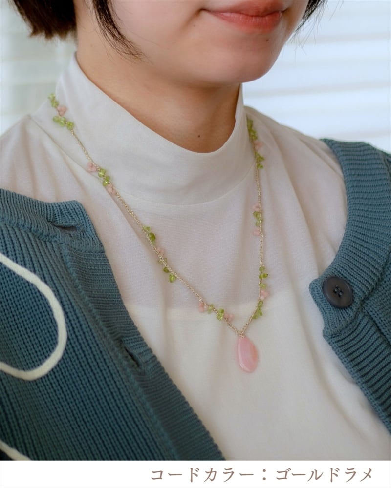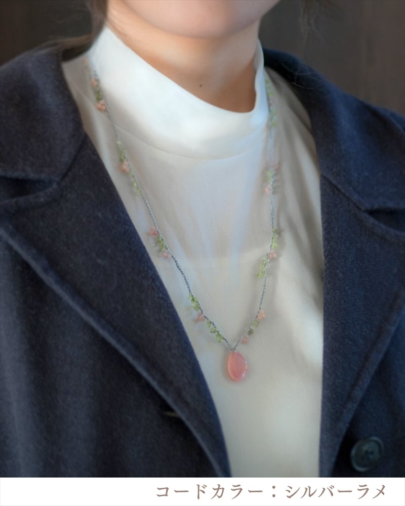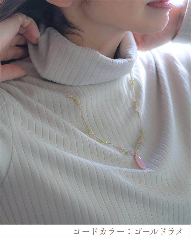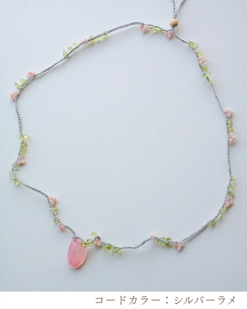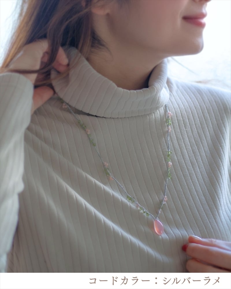 柔らかな色彩のピンクソープを3粒まとめて編み込み、その間にペリドットのさざれを散りばめ、枝から垂れる馬酔木の葉と花に見立てています。