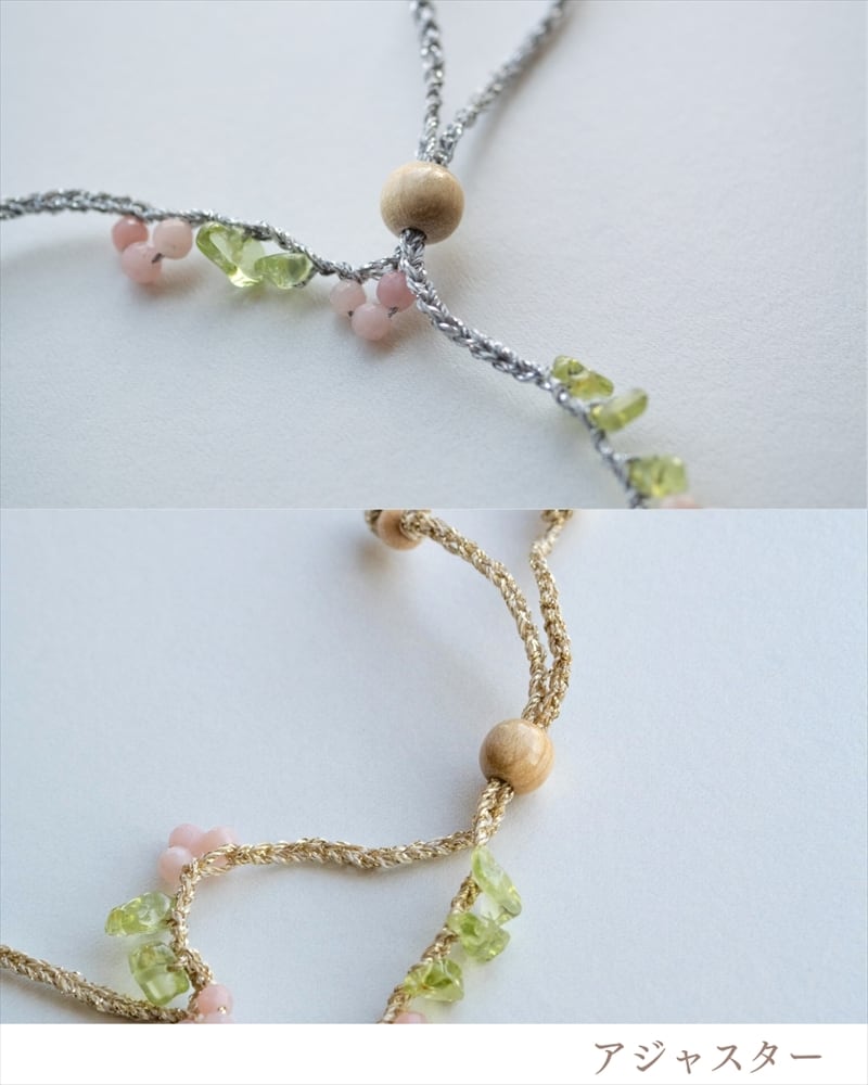 伸ばした状態でネックレスとしてもお使いいただけ、ウッドビーズをスライドさせて長さの調整が可能です。