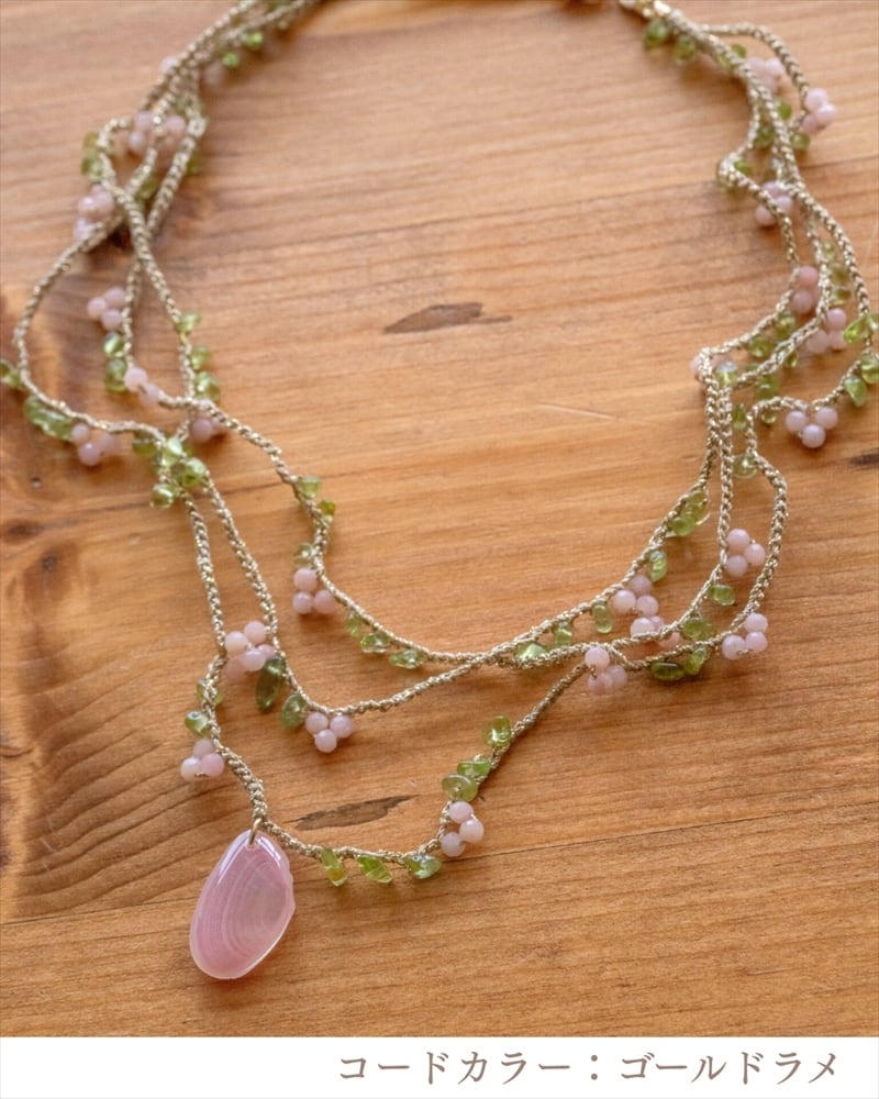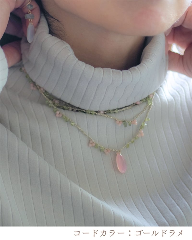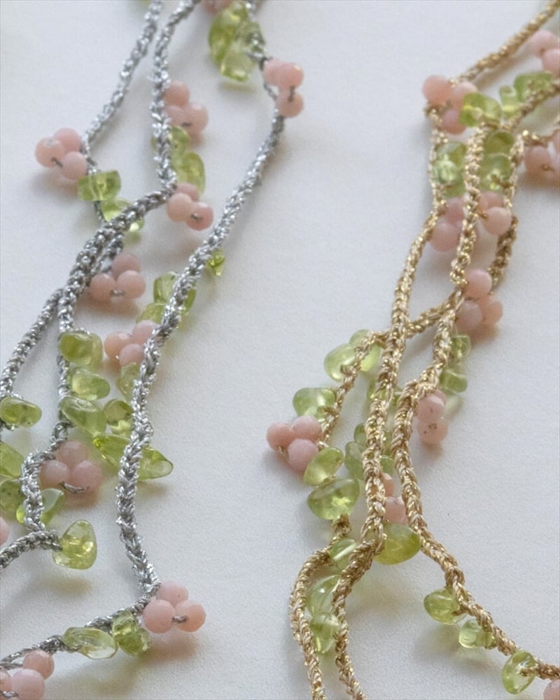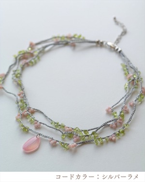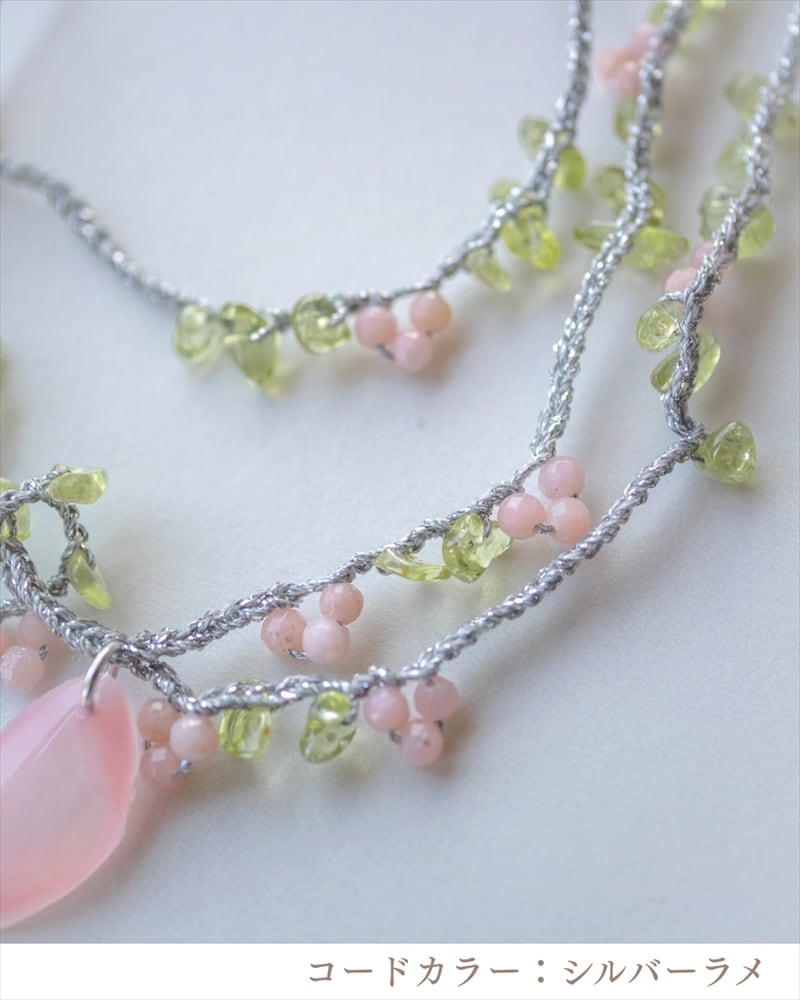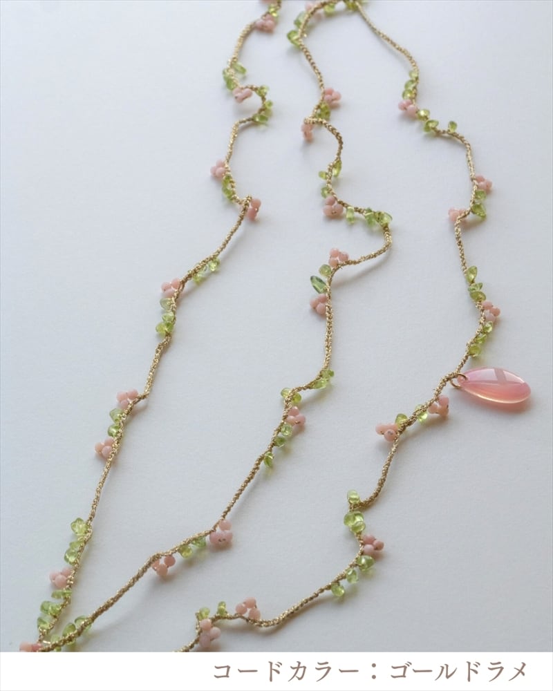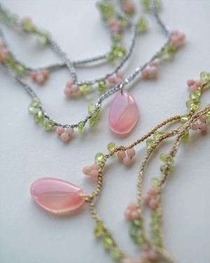 柔らかな色彩のピンクソープを3粒まとめて編み込み、その間にペリドットのさざれを散りばめ、枝から垂れる馬酔木の葉と花に見立てています。