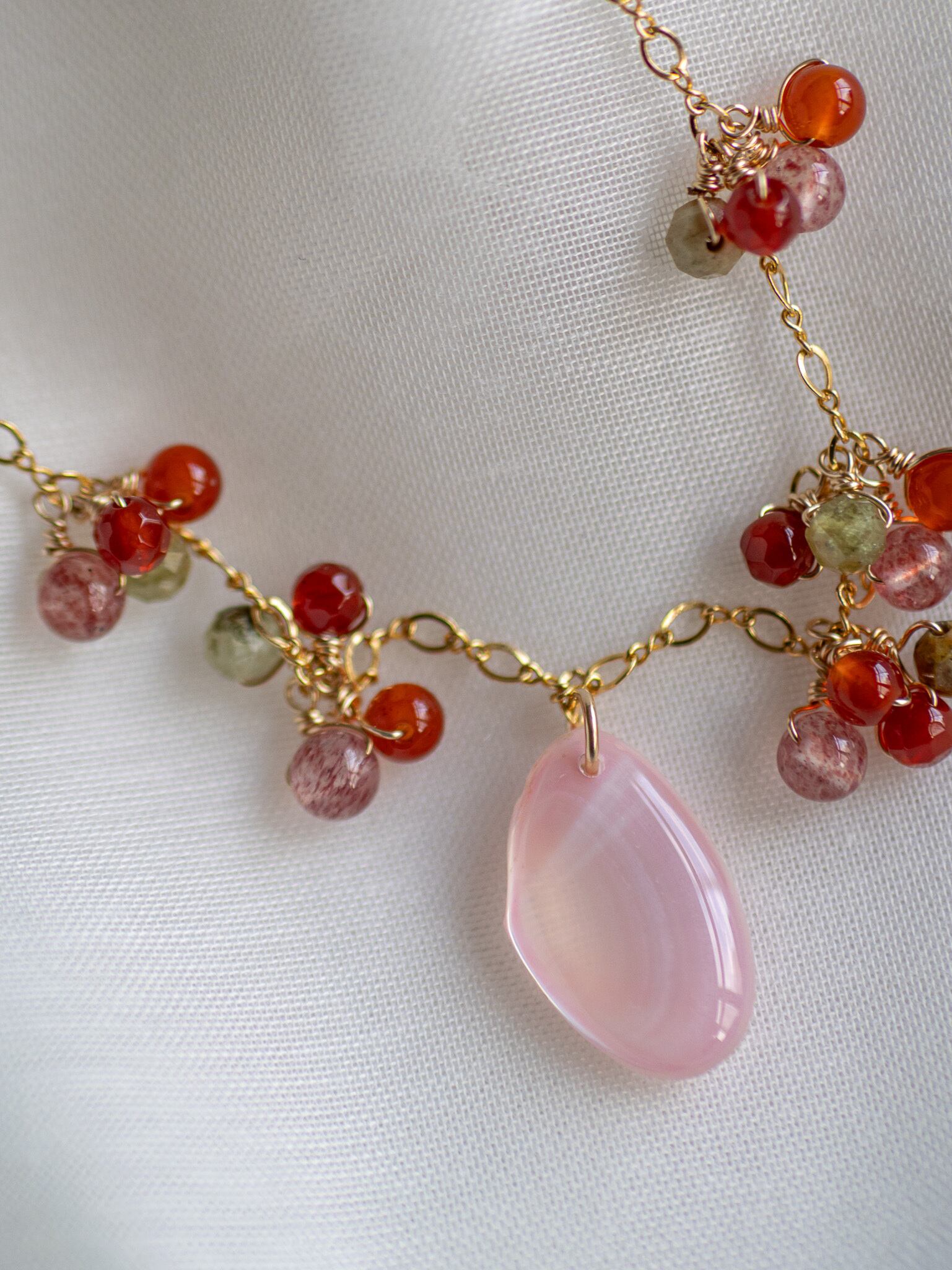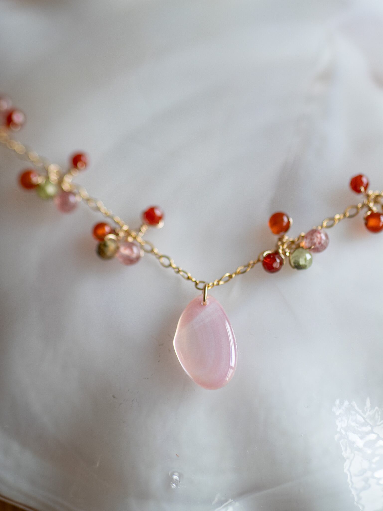 4粒の貴石を束ねた房を、さくらひとえを中心に6束華やかにあしらったネックレス。
