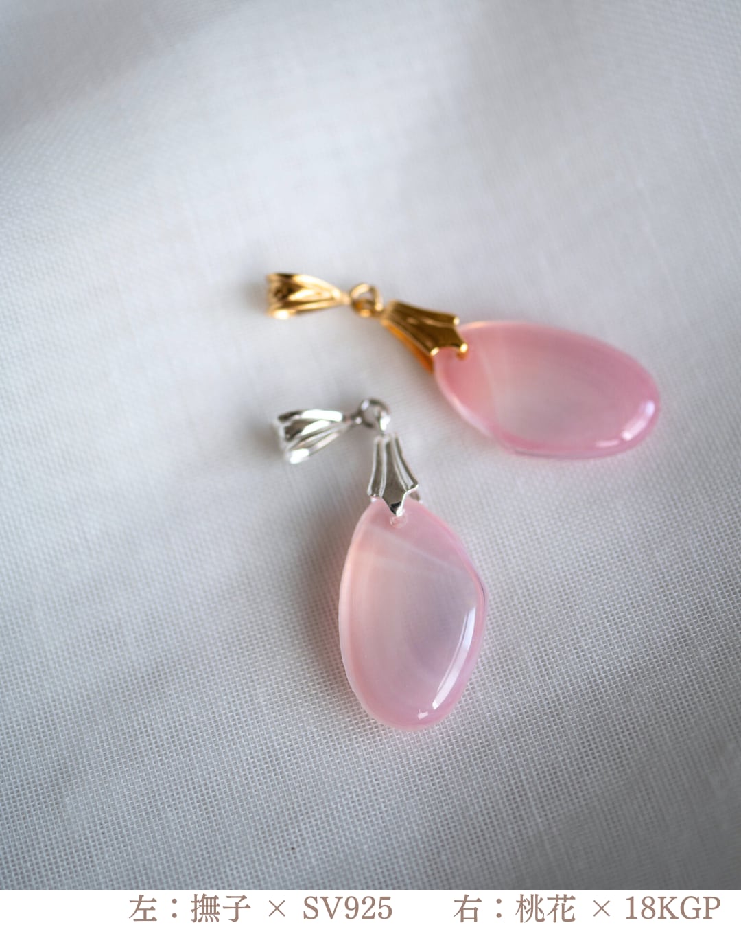 「さくらひとえ」シリーズは、その桜貝を特別な樹脂でふっくらとコーティング。海からすくい上げたばかりの滴をまとったような艶やかさが、桜貝本来のやさしい天然色を際立たせます。